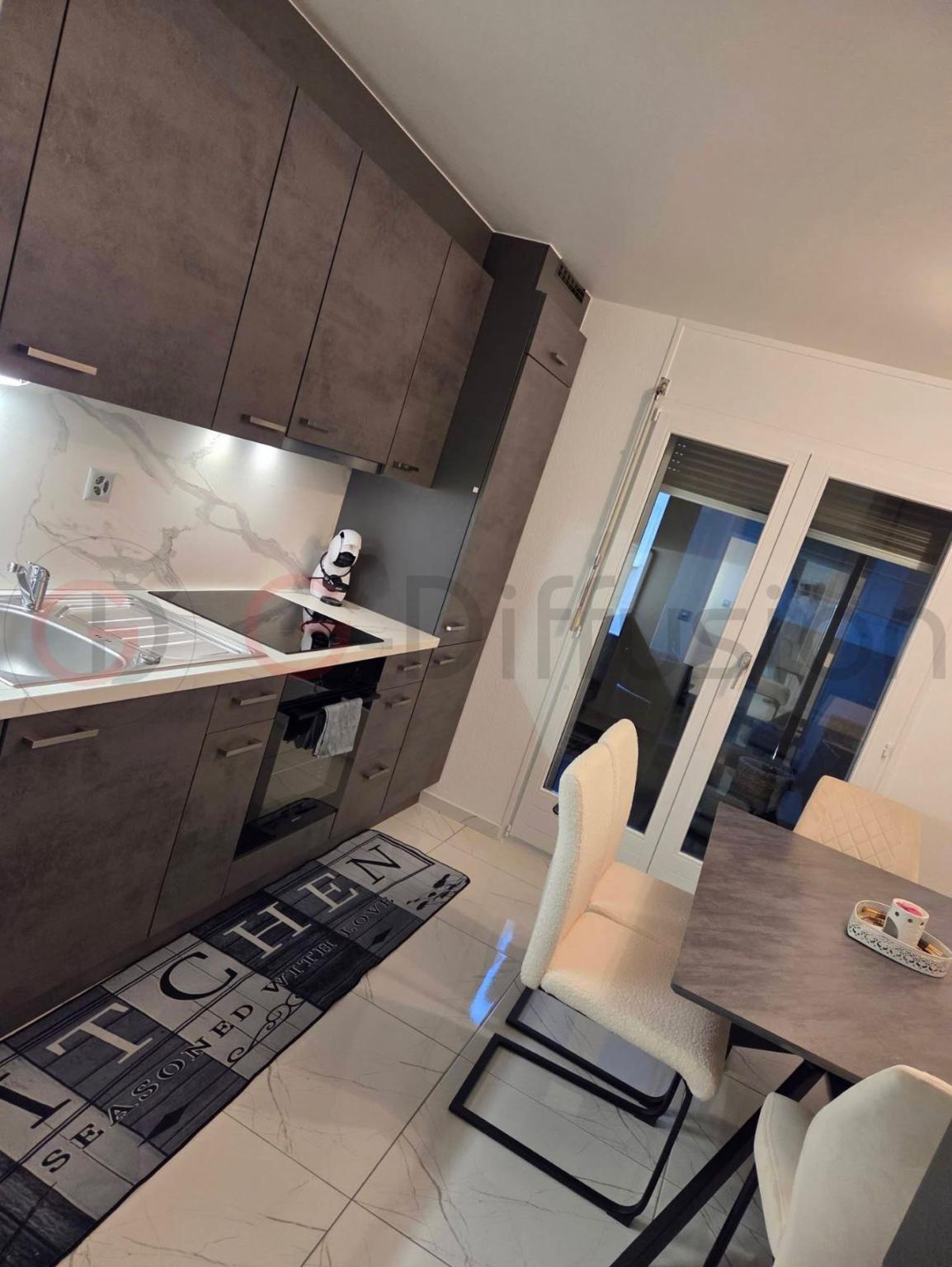 Cuisine moderne, neuve et entièrement équipée, avec accès à une véranda d’environ 5 m²